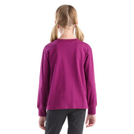 This girls' long-sleeve t-shirt puts Carhartt identity and dependability on full display. The tee is made from soft, durable cotton with ribbed collar and cuffs and side seams placed to maximize comfort. The shirt is hip length and has a scratch-free tagless neck label.